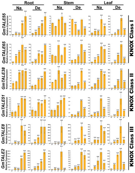 Quantitative RT-PCR analyses of the selected representative GmTALE genes in the KNOX subfamily during stress treatments throughout leaf, stem and root tissues. Data were normalized to the GmActin gene, and vertical bars indicated the standard deviations. The values represented the mean ± standard deviation (SD) of three independent replicates. Asterisks indicate the corresponding gene significantly up- or down-regulated compared with the 0-h statuses (* p < 0.05, ** p < 0.01, Student’s t-test). Na: saline stress; De: dehydration.