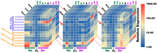 Compared to the transcriptome data, we additionally analyzed the selected GmTALE gene expressions in the leaf and stem tissues as well as explored the gene transcript levels after 24 h (24-h) stress treatments. Overall, the relative expressions of selected GmTALE genes significantly up-regulated at different time points, which indicated they were responsive to the saline and dehydration stresses but under distinct response patterns (Figure 9 and Figure 10). To better illustrate the diverse gene expression patterns of the selected GmTALE genes throughout tissues and different abiotic stresses, we integrated the obtained quantitative RT-PCR results and constructed a gene expression cubic heatmap in Figure 11. It is worth noting that the gene up-regulated levels under the abiotic stresses in stem tissue universally lower than those in root and leaf tissues (Figure 11). To sum up, the selected genes displayed distinct expression patterns during saline stress and dehydration in different soybean tissues, which may manifest their possible roles in responding to different abiotic stresses.