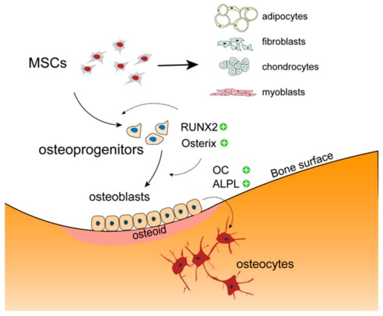 Osteoblasts are cells of major importance in bone remodeling and glucose homeostasis. Together with bone-resorbing osteoclasts and bone matrix-embedded osteocytes, they represent the main cellular components of skeletal tissue. The leading functions of mature osteoblasts include the synthesis of collagen type I, the most abundant organic matrix component in bone ensuring biomechanical stability and tensile strength. Unlike osteoclasts, osteoblasts are derived from mesenchymal stem cells (MSCs), precursor cells also giving rise to chondrocytes, adipocytes, myoblasts and fibroblasts [,]. Under the influence of runt-related transcription factor (RUNX2) and osterix, MSCs differentiate into pre-osteoblasts and eventually into osteoblasts (Figure 1).