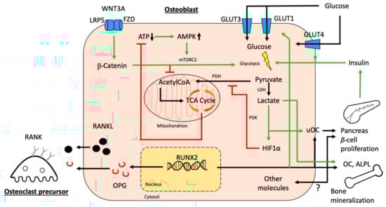 Several other mechanisms also increase aerobic glycolysis in osteoblasts. During early osteoblast differentiation, insulin-like growth factor 1 (IGF1) enhances glycolysis through activation of AMPK, whereas downregulation of AMPK with concomitant activation of mTORC2 is observed in later stages of differentiation []. Similarly, transforming growth factor beta (TGFβ) binds to type I and II transmembrane receptors and increases intracellular β-catenin, which then translocates into the nucleus and has been proposed to increase the expression of glycolytic enzymes such as PDK1 and lactate dehydrogenase A [,,]. While endogenous parathyroid hormone (PTH) stimulates bone resorption through increased expression of RANKL and degradation of RUNX2 [], clinically employed intermittent injections of PTH (iPTH) to boost bone formation enhance IGF1 as well as TGFβ signaling pathways and thus increase osteoblastic glucose uptake and aerobic glycolysis [,,].