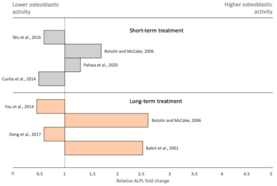 Osteoblastic responses towards hyperglycemia are so far best researched in the immortal preosteoblastic cell line MC3T3-E1. Here, the expression of RANKL increased up to 10 fold and OPG up to 30 fold under incubation with high glucose levels, indicating a suppressive effect on osteoclasts and overall bone remodeling []. While Wu et al. [] showed that short-term incubation with glucose levels higher than 15 mM increase ALPL mRNA expression, Pahwa et al. [] observed decreased ALPL activity. In yet another study, short-term hyperglycemia resulted in higher levels of collagen type I but reduced the secretion of OC []. Likewise, the results of long-term incubations with high glucose concentrations vary. Decreased osteoblastic ALPL activity, OC secretion and collagen synthesis were observed upon exposure to 25.5 mM glucose chronically [,]. Inconsistently, increased ALPL activity under incubation with 30 mM glucose was observed in a different study []. Therefore, in vitro studies of osteoblastic gene expression within a hyperglycemic environment display complex findings with astonishing variations, even if parameters such as glucose concentration, start and duration of treatment and osteoblastic cell type are taken into consideration (Figure 3). Interestingly, long-term treatment displayed two outliers with highly increased osteoblastic ALPL activity in comparison to short-term treatment. This observation is consistent with the normal to high bone density observed clinically in individuals with DM2. Nevertheless, diabetes represents a complex process involving multiple organ systems, such as pancreatic beta cells, blood vessels, neurons and bone. Even if in vitro experiments are partially qualified for investigation of underlying molecular patterns, solid and reliable conclusions on clinically observed effects cannot be drawn, and future research employing laboratory animals as well as large-scale clinical trials will be indispensable for investigations of bone phenotype in diabetes.