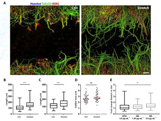 - Abraham, J.-A.; Linnartz, C.; Dreissen, G.; Springer, R.; Blaschke, S.; Rueger, M.A.; Fink, G.R.; Hoffmann, B.; Merkel, R. Directing Neuronal Outgrowth and Network Formation of Rat Cortical Neurons by Cyclic Substrate Stretch. Langmuir 2019, 35, 7423–7431. [Google Scholar] [CrossRef]