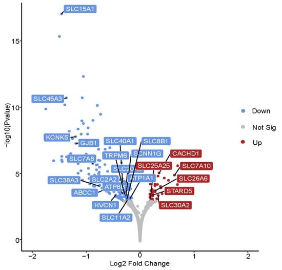 Volcano plot of the differentially expressed genes (DEGs) in female placentae. Blue, red, and grey dots denote downregulated ((FDR (false discovery rate) ≤ 0.1), upregulated (FDR ≤ 0.1), and non-differentially expressed (FDR > 0.1) genes in heat stress placentae (n = 5) compared to control placentae (n = 5). Gene symbols associated with placental transport activity are labelled.