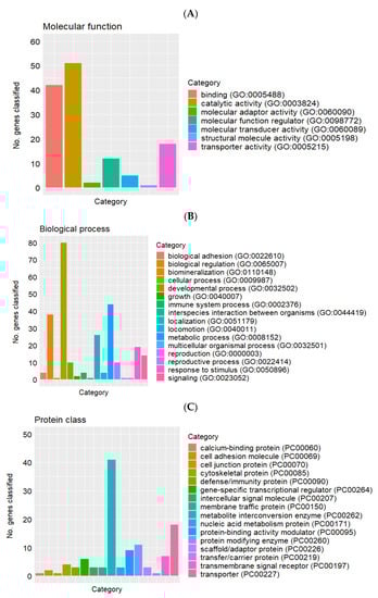 Functional classification of differentially expressed genes in placentae between heat stress (n = 5) and control (n = 5) groups in the gene ontology (GO) domains of (A) Molecular function, (B) Biological process and (C) Protein class.