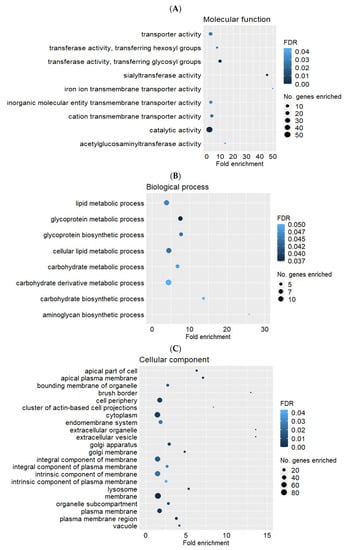 The upregulated and downregulated DEGs (HS compared with CON) were analysed separately by the statistical overrepresentation test, and the GO terms significantly enriched by the downregulated genes are depicted in Figure 3A–C. In the GO domain of molecular function (Figure 3A), maternal heat treatment decreased expression of genes associated with transporter activity (GO:0005215; FDR = 0.027), such as cation transmembrane transporter activity (GO:0008324; FDR = 0.023) and inorganic molecular entity transporter activity (GO:0015318; FDR = 0.031); and catalytic activity (GO:0003824; FDR < 0.001), including sialyltransferase activity (GO:0008373; FDR < 0.001). In the GO domain of biological process (Figure 3B), placental metabolic processes, such as aminoglycan biosynthetic process (GO:0006023; FDR = 0.052), carbohydrate metabolic process (GO:0005975; FDR = 0.049), glycoprotein biosynthetic process (GO:0009101; FDR = 0.044) and lipid metabolic process (GO:0006629; FDR = 0.046), were significantly enriched by the downregulated genes (HS compared with CON). In the GO domain of cellular component (Figure 3C), extracellular vesicle (GO:1903561; FDR < 0.001) and brush border (GO:0005903; FDR = 0.014) were the enriched GO terms with the highest fold enrichment by the downregulated genes (HS compared with CON). Despite there being 35 genes upregulated by maternal heat treatment, no GO term was significantly enriched (FDR > 0.05) by the upregulated genes (HS compared with CON). The full list of significantly enriched GO terms with their associated genes, gene ontology ID, FDR, and fold enrichment are listed in Table S1.