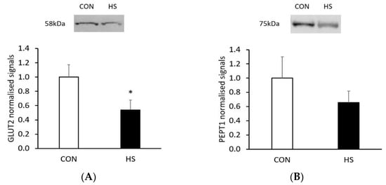 Relative protein expression of glucose transporter 2 (GLUT2; (A)) and peptide transporter 1 (PEPT1; (B)) in placentae between control (CON, n = 5) and heat stress (HS, n = 5) groups. Target protein expression was normalised to total protein loaded and expressed as normalised signals (arbitrary units). * p < 0.05. Error bars: standard error of the means.