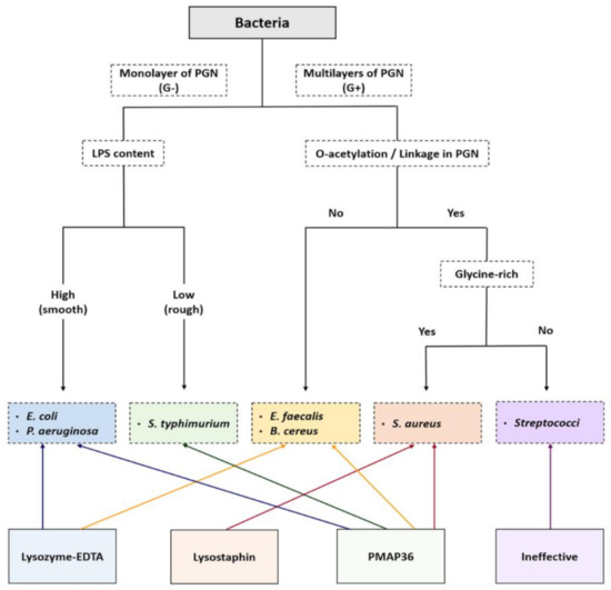 Differences in the structure and composition of the bacterial outer membrane and cell wall could cause variation in bacterial sensitivity to cell wall lytic proteins. We analyzed similarities and differences among 10 diverse bacterial species for their sensitivity to membranolytic enzymes and AMPs (Table 3, Table 4 and Table S3). The bacterial species employed in this study were classified into five groups depending on the structural characteristics of their cell walls, including proteoglycan layers (monolayer vs. multilayers), lipopolysaccharide (LPS) content (high vs. low), O-acetylation (presence vs. absence), and glycine abundance (rich vs. poor). Next, their experimental sensitivity to cell wall lytic proteins was matched to each group (Figure 2). Interestingly, PMAP-36 showed broad-spectrum sensitivity to the tested bacterial species, except for E. faecalis and streptococci.