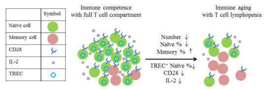 Lymphopenia can occur in normal physiological conditions or be associated with abnormal pathogenic status such as autoimmune diseases. It has been shown that the number of T cells is very low in the peripheral immune system of neonatal mice. In CD4+ T cells, adult percentages are not reached until postnatal day 7 in the lymph nodes and day 15 in the spleen [43]. This lymphopenic state can drive LIP in neonates [44]. With aging, the thymic output in the elderly is reduced, leading to a decreased percentage of peripheral naïve T cells, which can lead to LIP [45]. Furthermore, in animals, it has been demonstrated that CD4+ and CD8+ T-cell lymphopenia exists in the spleens of aged Balb/c mice [46]. In addition, we demonstrated that in Balb/c mice, age was inversely correlated with the number of total and naïve CD4+ T cells, and advanced aging resulted in LIP, given that the percentage of proliferating cells is inversely correlated with the percentage of naïve cells [47]. In fact, T cell lymphopenia, especially a decline of naïve T cells, is a typical marker of immune aging (immunosenescence) in both humans and mice [46,47,48]. With aging, the recent thymic emigrants (RTEs) reduce, resulting from thymic involution. Newly generated T cells contain T-cell receptor excision circles (TRECs), which are small circles of DNA generated in T cells during their development in the thymus. TRECs are unable to replicate, and are diluted due to cell division, thereby are considered as a marker of newly generated T cell output. It is demonstrated that the percentage of TREC+ cells declines by more than 95% from 20 to 60 years of age [49,50]. Other than T cell lymphopenia, several typical markers of immune aging are identified, including the loss of CD28 expression, decreased IL-2 production and IL-2 receptor expression, and fewer naïve T cells containing TRECs [48] (Figure 1). It is well established that the loss of CD28 expression in CD4+ and CD8+ T cells in the elderly [51,52,53]. CD28 is a critical costimulatory signal for complementing TCR derived signals and promoting T cell proliferation and IL-2 production. The loss of CD28 expression is typically seen in T cells that have gone through multiple rounds of replication, and of note, clonal CD28− T cells have been demonstrated to be autoreactive and resistant to apoptosis [54].