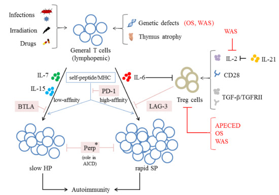 The induction, types and regulation mechanisms of LIP. Several triggers have been shown to induce lymphopenia including infection, irradiation, drugs, genetic defects, and thymus atrophy. LIP could occur via two pathways: slow homeostatic proliferation (HP) and rapid spontaneous proliferation (SP). HP is mediated by cytokines (IL-7 and/or IL-15) and interaction with self-peptide/MHC with low affinity. On the other hand, SP is regulated by cytokine IL-6 and interaction with self-peptide/MHC with high affinity. Treg cells might inhibit SP through LAG-3. Treg cells could be regulated by the presence of CD28, IL-2 production, and the TGF-β/TGFRII pathway; IL-21 could counteract Tregs function by inhibiting IL-2 production. IL-6 inhibits Treg cell function and expansion. PD-1 inhibits the LIP of T cells through its effect on peptide/MHC-II. BTLA negatively regulates the HP. Perp inhibits the persistence of T cells undergoing LIP through its role in activation-induced cell death; it is not known whether it exhibits a general role in both forms of LIP or in a certain form of LIP (∗). The roles of PIDs in the pathways of LIP are indicated in red. Arrows and T-bars indicate positive and negative effects, respectively.