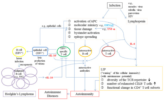 It is reasoned that EBV infection could enhance LIP of host autoreactive cells, thereby dampening the ability of cellular immunity to clear virus-infected host cells. This concept is supported by several studies. First, it has been demonstrated that EBV infection occurred in most Burkitt’s lymphoma (BL) cases in solid organ transplant recipients; the onset rate of BL was decreased in those patients who were EBV-seropositive at baseline compared to EBV-seronegative [202]. EBV is also associated with post-transplant lymphoproliferative disorder (PTLD). Second, it was found that decreased T-cell response to EBV gp110 glycoprotein, expressed in lytic cycle in RA, was correlated with inflammation and systemic involvement [197]. Third, very interestingly, it has been demonstrated the contribution of cytokines, TNF-α, IL-6, and IL-10, to the association of ADs with specific types of lymphoproliferative conditions based on evaluating the effect of single nucleotide polymorphism (SNP) of cytokines in the progression of lymphoma in concurrence with ADs [134].