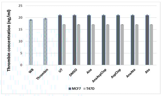 Thrombin is a known agonist of platelet activation, acting by binding to PAR receptors on platelets and facilitating fibrin formation from fibrinogen [,]. Baseline levels of thrombin were detected in pure whole blood (Figure 1). Thrombin generation was induced in whole blood exposed to breast cancer cells (MCF7 and T47D), thus promoting a hypercoagulable state. No significant differences were detected in levels of thrombin generated among the treatment groups (anastrozole, aspirin, and clopidogrel (AnaAspClop)) and controls; however, thrombin levels were generally higher in whole blood exposed to MCF7 cells than in whole blood exposed to T47D cells (Figure 1). This finding suggests that differences in thrombin levels were dependent on the type of cell line rather than the treatment and highlights differences in the capacity of MCF7 and T47D cells to induce a hypercoagulable state.