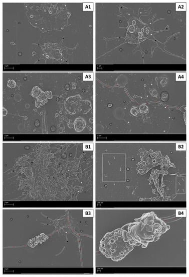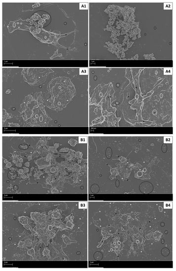 Platelet activation in whole blood exposed to AnaAspClop-treated MCF7 cells (A1,2) and T47D cells (A3,4), as well as corresponding antiplatelet control (AspClop), (B1,2) (MCF7 cells) and (B3,4) (T47D cells). Advanced stages of platelet activation were induced with the AnaAspClop treatment in both cell lines; however, less platelet clumping/clot formation was evident compared to the antiplatelet control. Annotations: black * = pseudopodia; black circle = microparticles; white rectangle (with/without white arrows) = fibrin formation; white * = hyalomere spread.