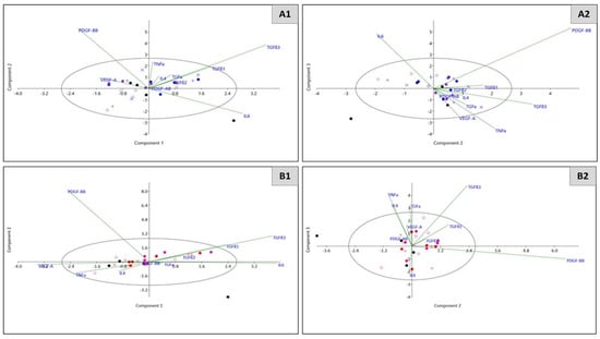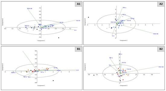 Scatterplot representing the relationship between cytokines (IL1β, TNF-α, PDGF-AB, IL6, PDGF-BB, VEGF-A, IL4, IL10, TGF-α TGFβ -1, -2, -3) following whole blood exposure to AnaAspClop-treated cells (MCF7/T47D) across principal components 1, 2 and 3, on an eigenvalue scale with 95% ellipse. MCF7 cell culture group (A1-2): WB control–black circle, Media control–blue +, Diluent control–blue x, Anas control–blue circle, AspClop control–purple circle, AnasAspClop (EXP)–purple diamond. T47D cell culture group (B1-2): WB control–black circle, Media control–red +, Diluent control–red x, Anas control–red circle, AspClop control–pink circle, AnasAspClop (EXP)–pink diamond.