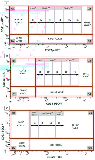 Scatterplots showing gating strategy used to investigate changes in expression levels of activation markers: CD62p and CD63 in platelets (CD41a). (A) Representative quadrants and intervals used to show the expression of CD62p only in CD41a platelets; (B) representative quadrants and intervals used to show the expression of CD63 only in CD41a platelets; and (C) representative gates and intervals used to define CD41a platelets expressing both CD62p and CD63.