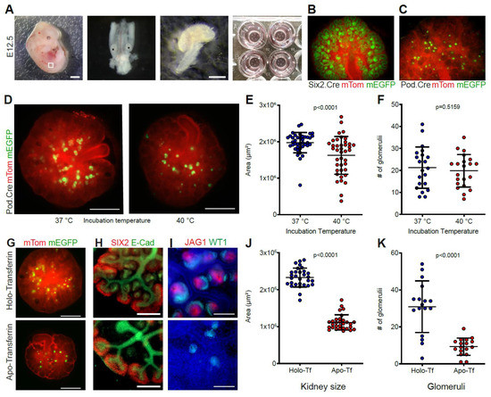 Use of metanephric organ cultures to study the effect of environmental conditions on renal development. (A) The urogenital ridge from E12.5 mouse embryos (left panel) was microsurgically extracted (second panel), and the kidneys were isolated (third panel) and placed on Transwell inserts (right panel). Scale bars: 1 mm (left panel), 500 µm (third panel). (B) Transgenic mice with dual Tomato/EGFP expression were used for conditional labeling of Six2-positive cells and their offspring using Six2.Cre or (C) podocin-positive cells using Pod.Cre mice. (D) Explants from the same embryo cultured for 7 days at 37 or 40 °C. Scale bars: 500 µm. (E) Surface areas of explants grown for 7 days at 37 or 40 °C. n = 40 pairs, paired t-test, mean ± SD. (F) Number of glomeruli in the explant groups after 7 days. n = 21 pairs, paired t-test, mean ± SD. (G) Explants from the same embryo cultured for 7 days in medium containing holo-Tf or apo-Tf. Scale bars: 500 µm. (H) Widefield images of holo-Tf and apo-Tf cultured explant pair stained against SIX2 and E-cadherin after 48 h of culture show normal progenitor cell pool and defects in early nephron morphology. Scale bar: 100 µm. (I) Widefield images of holo-Tf and apo-Tf cultured explant pair stained against WT1 and JAG1. Scale bars: 100 µm. (J) Surface areas of holo-Tf and apo-Tf cultured explants after 7 days. n = 30 pairs, paired t-test, mean ± SD. (K) Number of glomeruli in the explant groups after 7 days. n = 17 pairs, paired t-test, mean ± SD.