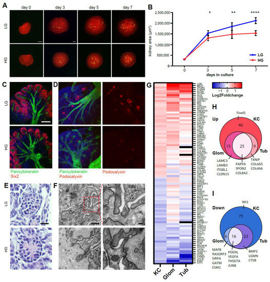 Ex vivo high glucose exposure leads to diabetic nephropathy-associated changes in the developing kidney. (A) Embryonic kidneys from Pod.Cre;Tomato/EGFP animals cultured for 7 days in low glucose (LG, 5.5 mM α-D-glucose, 55 mM mannitol) or high glucose (HG, 55 mM α-D-glucose) conditions. Scale bar: 500 µm. (B) Kidney surface area of HG and LG conditions. *, p = 0.0474; **, p = 0.0052; ****, p < 0.0001. Paired t-test, mean ± SD. (C) Confocal immunofluorescent stainings of day 7 kidney cultures against Six2 and (D) podocalyxin with pan-cytokeratin and Hoechst. Scale bar: 100 µm. (E) Stainings of 6 µm sections from day 7 kidney cultures. Scale bar: 20 µm. (F) Transmission electron microscopy of sections from day 7 kidney cultures. Glomerular basement membranes are thickened in kidneys exposed to high glucose conditions. Left column: magnification showing podocyte foot processes. Scale bars: 500 nm (left panels), 100 nm (right panels). (G) Fold change of RNA-seq data from HG compared to LG kidneys and ERCB diabetic nephropathy (DN) patient microarray data from microdissected glomeruli and tubules showing differentially expressed genes. (H) Genes upregulated in the kidney cultures (KC) overlapping with ERCB DN patient data and selected genes highlighted. (I) Genes downregulated in the kidney cultures (KC) overlapping with ERCB DN patient data and selected genes highlighted.