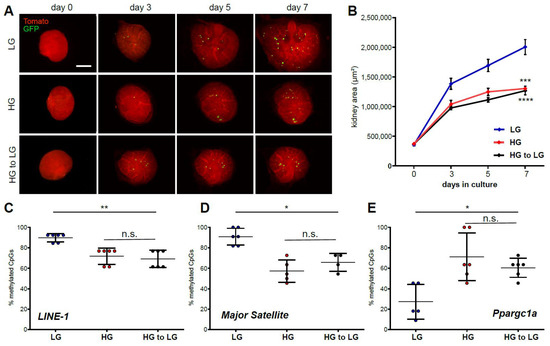 To further understand the molecular changes mediated by a hyperglycemic environment, kidney cultures were grown at high glucose conditions for 3.5 days and then changed to low glucose conditions for the same amount of time (Figure 3A). Remarkably, incubation under physiological conditions after the shorter incubation period in high glucose medium did not reverse growth reduction after 7 days in culture with the cultures growing at the same rate as under continuous high glucose treatment (Figure 3B). Furthermore, DNA methylation showed hypomethylation of LINE-1 element and major satellite loci (Figure 2C,D), as well as sustained DNA hypermethylation of the Ppargc1a promoter, under both high glucose and reversed conditions (Figure 3E), indicating the formation of metabolic memory via DNA methylation due to the earlier adverse environmental conditions as a means of fetal programming.