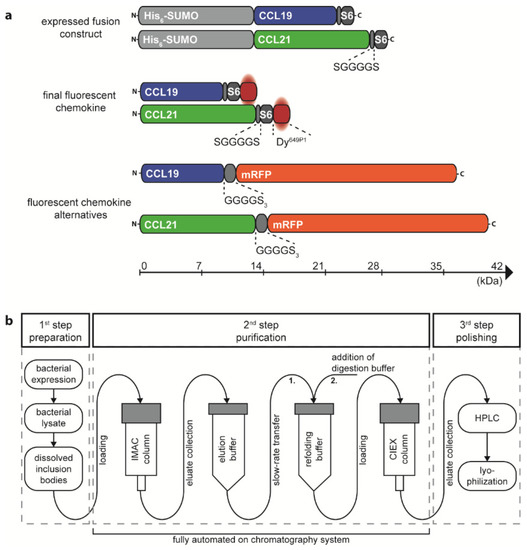 Design and production of the recombinant chemokines CCL19 and CCL21. (a) Schematic representation of the size matched expression constructs and the corresponding final fluorescently labeled chemokine proteins. A cleavable His6-SUMO-tag is fused to the N-terminus of mature human CCL19 and CCL21 followed by a short, flexible linker and the S6-tag for enzymatic labelling with the dye Dy649P1. Human CCL19-mRFP and CCL21-mRFP are included for size comparison. (b) Workflow overview of the chemokine production process. IMAC purification, chemokine refolding, and CIEX purification can be performed in an automated fashion on a chromatography system.