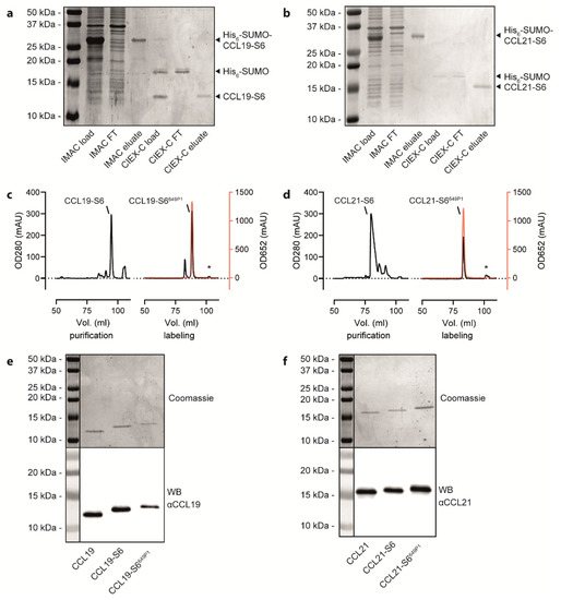 Freshly prepared or reconstituted, recombinant human CCL19-S6 and CCL21-S6 were site-specific fluorescently labeled using the phosphopantetheinyl-transferase Sfp, which transfers the fluorescent dye (here Dy649P1) conjugated phosphopantetheine moiety of CoA to the first serine residue of the S6-tag. An additional reverse-phase HPLC purification step served to separate the fluorescently labeled CCL19-S6649P1 or CCL21-S6649P1, respectively, from residual substrate bound to the Sfp transferase (marked with asterisks in Figure 2c,d). Figure 2c,d illustrate the high efficiency of chemokine labeling using this strategy. SDS-PAGE followed by Coomassie-staining or Western blotting revealed the correct size of the recombinant chemokine variants (Figure 2e,f) that match the calculated molecular weights of native CCL19 (8.80 kDa), CCL19-S6 (10.50 kDa), CCL19-S6649P1 (12.58 kDa), as well as of native CCL21 (12.25 kDa), CCL21-S6 (13.95 kDa), and CCL21-S6649P1 (16.03 kDa).