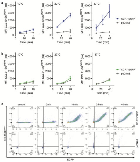 To complement our functional activity results, we tested the binding abilities of the fluorescently labeled chemokines to CCR7-expressing cells. For this, we incubated HeLa cells transiently expressing CCR7-EGFP at various temperatures for different time periods with 25 nM of the fluorescently labeled chemokines. At 10 °C, CCL19-S6649P1 specifically bound to CCR7 transfected, but not to mock transfected cells (Figure 4a). Shifting the temperature to 22 °C, which still prevents receptor internalization, profoundly enhanced the specific binding of CCL19-S6649P1 to CCR7-expressing cells (Figure 4a). Cell associated, chemokine-derived fluorescence was highest upon incubation at 37 °C (Figure 4a), where CCL19-S6649P1 binds to CCR7 and subsequently promotes its co-internalization with the receptor [44]. Notably, CCL21-S6649P1 interacted with both CCR7-expressing and vector control transfected HeLa cells at all temperatures tested (Figure 4b). This is likely due to the increased binding ability of CCL21 to glycosaminoglycans and charged carbohydrates on the cell surface [5,6,8,45]. The enhanced GAG binding ability of CCL21 compared to CCL19 [46], suggests that CCL21-S6649P1 may be useful for visualizing the haptotactic CCL21 gradients rather than for labelling CCR7-expressing cells. Importantly, time-series experiments revealed that specific binding of CCL19-S6649P1 to CCR7-EGFP expressing HeLa cells, but not to vector control transfected cells, was easily recorded after 10 min and reached a plateau after 25 to 40 min of incubation at 22 °C (Figure 4c). Hence, CCL19-S6649P1 is an excellent fluorescent reagent to specifically mark CCR7-expressing cells.