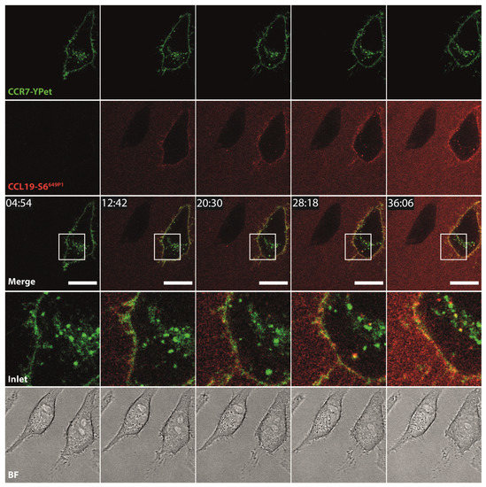 To further explore additional applications for the fluorescent chemokines, we incubated HeLa cells transiently expressing CCR7-YPet with fluorescently labeled CCL19-S6649P1 and followed receptor-mediated internalization of the chemokine by live-cell confocal video microscopy. We focused on CCL19 as only this ligand is efficiently internalized by CCR7 as reported previously [44,47]. Upon addition to the medium at 37 °C, CCL19-S6649P1 diffused within the medium and bound to CCR7-YPet expressed on the surface of transiently transfected HeLa cells. Subsequently, CCL19-S6649P1 was rapidly internalized by CCR7-YPet expressing cells where the chemokine co-localized with its receptor in intracellular vesicles (Figure 5, Supplementary Video 1). Critically, CCL19-S6649P1 did not bind to and was not internalized by neighboring, untransfected HeLa cells (Figure 5).