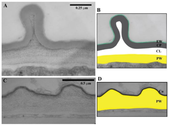 - Mazurek, S.; Garroum, I.; Daraspe, J.; de Bellis, D.; Olsson, V.; Mucciolo, A.; Butenko, M.A.; Humbel, B.M.; Nawrath, C. Connecting the Molecular Structure of Cutin to Ultrastructure and Physical Properties of the Cuticle in Petals of Arabidopsis. Plant Physiol. 2017, 173, 1146–1163. [Google Scholar] [CrossRef]