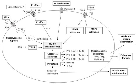 Besides surface membrane-bound receptors such as TLRs, which survey the extracellular environment, the innate immune system also contains a special system of intracellular receptors, e.g., the nucleotide-binding and oligomerization domain (NOD)-like receptors (NLRs) [32]. In silica-induced lung inflammation and injury, NLRP3 inflammasome is of fundamental importance. NLRP3 inflammasome is an intracellular complex structure that contains a C-terminal leucine-rich repeat (LRR) for ligand recognition, a central NBD (NACHT) domain for an oligomerization, and a N-terminal pyrin domain (PYD) for a signal transduction [9]. This NLRP3 protein binds to an adaptor protein (apoptosis-associated speck protein) with a caspase activation and recruitment domain (ASC), and the caspase-1. NLRP3 protein serves as a protein complex platform, while ASC bridges NLRP3 to caspase-1, allowing for its activation [30]. When caspase-1 is activated, it cleaves immature, pro-forms of interleukins (IL)-1β, IL-18, and IL-33 to mature, active forms. IL-1β, IL-18, IL-33, high mobility group box 1 protein (HMGB1), and some heat-shock proteins facilitate various inflammation processes, including fever, promoting T-cell survival, B-cell proliferation, mediation of leukocyte transmigration, etc. [33]. In addition, caspase-1 induces a pyroptosis, a special, highly inflammatory type of cell death characterized by both apoptotic and necrotic features. In this process, deoxyribonucleic acid (DNA) cleavage, nuclear condensation, and rupture of the plasma membrane are accompanied by a release of pro-inflammatory mediators including IL-1α, IL-1β, IL-18, and HMGB1 [34].