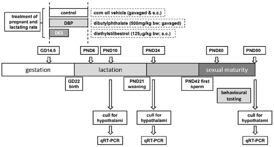 Nine-week old female Sprague-Dawley rats from Laboratory Animal Services (University of Adelaide) were mated overnight and checked the next morning for the presence of sperm in vaginal smears. The morning when sperm were observed in the vaginal smears was designated as gestation day 0.5 (GD0.5). The day when the pups were delivered was designated as postnatal day 1 (PND1). Pregnant rats and their offspring were maintained on soy-free standard AIN93G rodent diet (Specialty Feeds, Western Australia, Australia) throughout the experiment. Pregnant rats were divided into 3 groups, using randomization of body weights to ensure equal weight distribution among groups, and dosed as following: Control group (n = 8): orally gavaged with corn oil (Sigma-Aldrich, North Ryde, NSW, Australia; #C8267) 1 mL/kg body weight every second day from GD14.5 to PND6 and subcutaneously (s.c.) injected with corn oil containing 0.5% ethanol on GD14.5 and GD16.5. DBP group (n = 9): orally gavaged with DBP (Sigma-Aldrich; #524980, >99% pure) 500 mg/kg body weight in corn oil every second day from GD14.5 to PND6 and s.c. injected with corn oil containing 0.5% ethanol on GD14.5 and GD16.5. DES group (n = 12): orally gavaged with corn oil 1 mL/kg body weight every second day from GD14.5 to PND6 and s.c. injected with DES (Sigma-Aldrich; #D4628, >99% pure) 125 µg/kg body weight in corn oil containing 0.5% ethanol on GD14.5 and GD16.5 only. The doses of DES and DBP used were based on the mid-range effective values from previous studies (e.g., [,,,,]). Whilst likely giving rise to circulating levels substantially higher than those measured for equivalent substances in the human population, these limited doses (which are less than the ED50 for impacts on male physiology in the rat and are reported to have no immediate impact on female physiology [,]) appear to indicate appropriate phenotypes in rats with high penetrance, and low general toxicity, allowing relatively small group numbers in accord with 3R principles. The doses are moderately greater than the latest LOAELs reported for DBP (2 mg/kg/d) or DES (0.5 µg/kg/d) in the context of reprotoxic effects in rats [,], with a tolerable daily intake dose for DBP in the human population of 0.01 mg/kg/d [], and which are used to guide regulatory decision-making. On PND2, excess pups were culled, retaining 10 pups (female:male ratio ~1:1) per litter. On PND21, both male and female pups were weaned and caged with their littermates of the same gender. Male and female progeny were culled by CO2 asphyxiation as indicated on PND10, 24 and 90 (Figure 1).