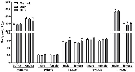 Administration of DES to rats at high doses has previously been associated with abortion of fetuses []. For this reason, DES was given to pregnant rats only on GD14.5 and GD16.5, within the masculinization window, and not at all during lactation [,,]. The maternal rats showed a small acute weight loss following DES administration at GD20.5, unlike in controls and DBP-treated animals (Figure 2). Two out of the initial 12 rats in this group had still-births, whereby no live pups were born. Excluding these two rats, DES treatment led to a marginally smaller litter size (10.8 ± 1.5), compared to control (13.6 ± 1.0) or DBP (12.0 ± 0.8) groups (not significant). Once born, all pups grew well and healthily, with no differences in body weight between groups at PND10 and PND24 (Figure 2). At weaning on PND21, both male and female DES pups showed a significant (p < 0.05) 6–7 percent increase in body weight compared to control and DBP groups (data not shown), which, however, did not persist into adulthood (Figure 2).