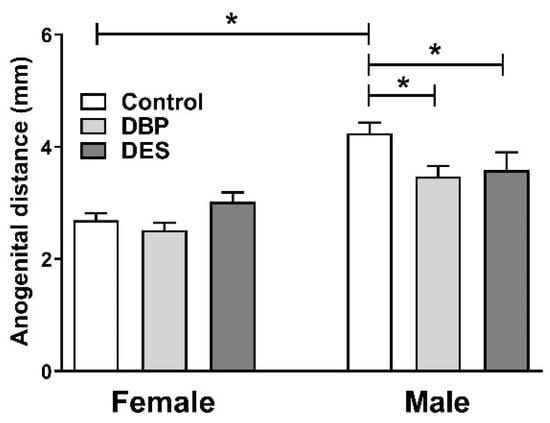Anogenital distance measured at PND10 (means ± SEM, n = 11–16 per individual category) for male and female pups maternally treated with DBP or DES, compared to controls. Horizontal bars and asterisks indicate significant differences (p < 0.05). Data were analyzed by ANOVA, followed by post hoc Tukey’s multiple comparison test.