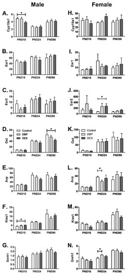 Hypothalami were carefully dissected from male and female progeny at PND10, PND24, and at the termination of the study on PND90. The tissues consistently included the major magnocellular and parvocellular nuclei of the preoptic, suprachiasmatic, supraoptic, paraventricular, periventricular, and geographically closely related regions. Gene transcripts were selected for analysis, which have been implicated in sexual or affiliative behavior (Cyp19a1, Avp, Oxt, Esr2, respectively encoding aromatase, vasopressin, oxytocin, and ERβ), in puberty onset (Kiss1, encoding kisspeptin), or in regard to regulation of the HPG axis (Esr1, Gnrh1, encoding ERα and GnRH). For both males and females, results were encouragingly consistent, with mostly small standard errors and little, if any, variance between treatments (Figure 4). This important observation reinforces the technical accuracy of the analysis and serves to emphasize the few small changes that were found to be statistically significant. For the male progeny at PND 10, Cyp19a1 gene expression (Figure 4A) was significantly reduced in the DES group compared to controls, whereas, in the same treatment group, Kiss1 gene expression was slightly but significantly elevated (Figure 4F). At later time-points, only Oxt gene expression showed a consistent effect of treatment, with DES causing a significant reduction in this specific hypothalamic mRNA (Figure 4D). In the female progeny, interestingly, quite different genes were impacted upon by the maternal xenobiotic treatment. There were no significant effects evident at PND10 but, at PND24, with the onset of female puberty, there was a marked increase in Esr2 mRNA for both DBP and DES (Figure 4J), though significance (p < 0.05) was only achieved for the DES group. Only DBP-treatment gave rise to a reduction in Avp gene expression at this time-point (Figure 4L), and also to an increase in specific Gnrh1 gene expression (Figure 4N). There were no significant differences in gene expression in any of the PND90 female samples.
