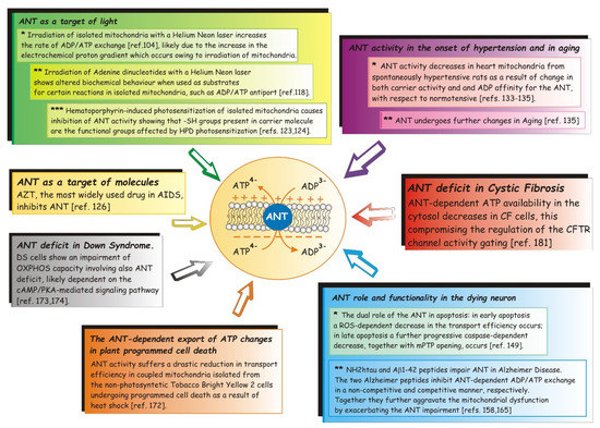 We were still students when we collaborated in the tuning of the method that allows for the measuring of the ADP/ATP exchange by monitoring the extramitochondrial efflux of ATP gradually produced inside mitochondria for oxidative phosphorylation (OXPHOS) as a result of ADP addition and uptake into mitochondria. Even today we meet ANT in our study/research path in a great variety of diseases in which it is involved due to its pivotal role in cellular metabolism. Not only will we see in this roundup of research what the effect of laser light is on ANT activity and how it reacts following drug photosensitization of isolated mitochondria, but also how the antiviral drug 3′-Azido-3′-deoxythymidine (AZT) affects it, and even how its impairment leads to mitochondrial energy deficit in Down syndrome (DS), as well as its involvement in Alzheimer disease (AD) progression, in which its function intertwines with those of the two AD proteins, i.e., β-amyloid and TAU, and so on.