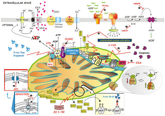 - Bobba, A.; Amadoro, G.; Petragallo, V.A.; Calissano, P.; Atlante, A. Dissecting the molecular mechanism by which NH2htau and Aβ1-42 peptides impair mitochondrial ANT-1 in Alzheimer disease. Biochim. Biophys. Acta. 2013, 1827, 848–860. [Google Scholar] [CrossRef]