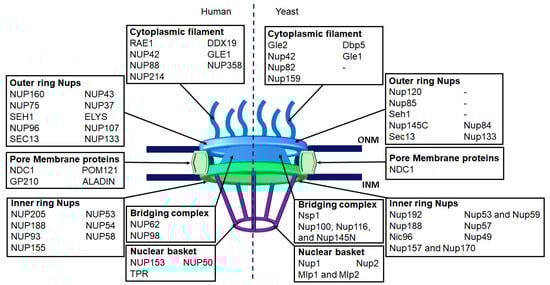 The NPC is the principal gateway between the nucleus and cytoplasm. There are more than a hundred to more than a thousand NPCs on the NE of a yeast cell [] and a human cell [], respectively. NPCs are huge protein complexes penetrating and bridging the inner and outer nuclear membrane [,]. A fully assembled NPC in vertebrates consists of multiple copies of about 30 different Nups with an estimated molecular mass of 120 MDa []. The three-dimensional structure of NPCs shows an eight-fold rotational symmetry and contains several major domains, such as cytoplasmic filaments, nuclear basket, central transport channel, and a core scaffold that supports the central channel [,]. The exact place of each Nup in an NPC plus their structure and functions are summarized in Figure 1 and Table 1.