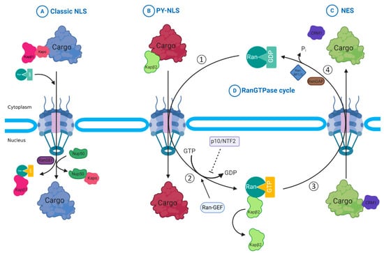 The NCT of most protein and transcript cargos (except mRNAs) depends on RanGTP-RanGDP gradient across the nuclear membrane, which provides a driving force and is generated by RanGTPase and its regulators []. The nucleus contains a high concentration of Ran that binds to GTP to form RanGTP, while the RanGDP is more concentrated in the cytoplasm. There is a mechanism for attaching/detaching of cargos from importins/exportins (Figure 2). Importins bind to the cargo in the cytoplasm in the presence of RanGDP and release cargo in the nucleus in the presence of RanGTP and exactly opposite manner occurs for exportins. In these processes, GTPase activity of Ran, the binding of Ran to GTP or GDP, and their subcellular distributions are tightly controlled by a set of regulators, such as Ran-binding proteins (RanBPs), Ran GTPase-activating protein (Ran-GAP), Ran guanine nucleotide exchange factor (Ran-GEF), and Ran-GDP dissociation inhibitor (Ran-GDI).