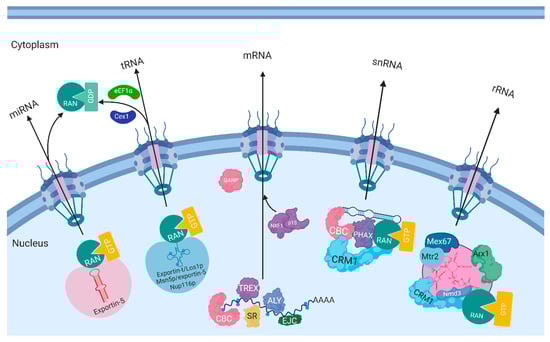 Nuclear RNA export could be disrupted by any alterations in the exporting process, such as the changes in the NE including any alterations in the Nups which make NPCs, dysregulations of Ran gradient and its regulatory proteins, and variations in the proteins which attach to the RNAs and assemble RNPs [,]. Accumulating evidence indicates that RNA transport is impaired in several neurodegenerative diseases (NDs), which will be discussed in the following sections.