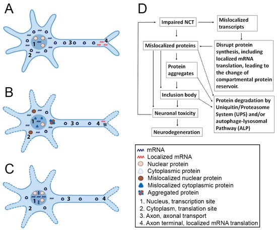 If nuclear transcript export mechanisms are impaired in a neuron (Figure 5C), the normal distribution of RNAs will be disrupted, such as nuclear RNA accumulation and mRNA mislocalization. These abnormal subcellular distribution of RNAs will dysregulate the protein synthesis, such as localized mRNA translation in axons and dendrites, leading to abnormal compartmental protein reservoirs [,,]. Finally, the effects of impaired NCT, no matter the dysregulated protein transport or the disrupted nuclear RNA export, will be converged to neuronal toxicity and dysfunction, resulting in neurodegeneration and clinical manifestation of the disease (Figure 5D).