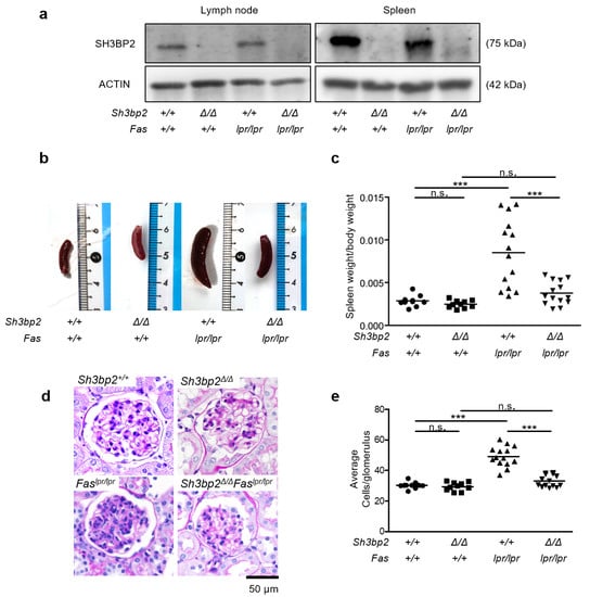 SH3BP2 deficiency improves splenomegaly and the proliferative changes in glomeruli of the Faslpr/lpr lupus-prone mice. (a) Immunoblot analysis for SH3BP2. Protein samples were collected from lymph nodes and spleens of the indicated mice. SH3BP2 protein levels were determined by western blotting. Actin was used as the loading control. (b–e), Sh3bp2+/+ (n = 10), Sh3bp2Δ/Δ (n = 10), Faslpr/lpr (n = 14), and Sh3bp2Δ/ΔFaslpr/lpr mice (n = 14) were analyzed at the age of 35 weeks. (b) Representative images of the spleen. (c) Spleen weights per body weights were determined. (d) Representative images of periodic acid-schiff (PAS)-stained kidney sections. Original magnification, 400×. Bar, 50 μm. (e) Quantification of the number of cells in the glomeruli. At least 10 glomeruli per mouse were assessed. The numbers of nuclei in the glomerular cross-sections were counted, and the averages of the nuclei per glomerulus were determined. Each dot denotes an individual mouse, and horizontal lines represent the means. *** p < 0.001; n.s. = not significant.