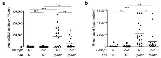 B6. MRL-Faslpr/lpr mice (#000482, referred to as Faslpr/lpr mice) and Cd19-Cre mice (#006785) were obtained from Jackson Laboratory (Bar Harbor, ME, USA). Sh3bp2-floxed mice have been generated by inGenious Targeting Laboratory, as reported previously []. In the Sh3bp2-floxed mice, Sh3bp2 exon3 is flanked by loxP sites. To generate B cell-specific SH3BP2-deficient mice, the Sh3bp2-floxed mice were crossed with the Cd19-Cre mice. To generate SH3BP2 systemic knockout mice, the Sh3bp2-floxed mice were crossed with EIIa-Cre mice (#003724, Jackson Laboratory), in which Cre recombinase is expressed in the germ cells []. Elimination of the EIIa-Cre allele was achieved by crossing with mice without the EIIa-Cre allele, resulting in SH3BP2 systemic knockout (Sh3bp2Δ/Δ) mice. All mouse studies were performed using male and female mice of the C57BL/6J background. All mutant mice were maintained in the animal facility of Kawasaki Medical School (Okayama, Japan), and were housed in a group (2–5 mice/cage) and maintained at 22 °C under a 12h:12h light/dark cycle with free access to water and standard laboratory food (MF diet, Oriental Yeast Co., Tokyo, Japan). All animal experiments were approved by the Safety Committee for Recombinant DNA Experiments (Nos.14-32 (7 January 2015), 15-24 (9 October 2015), and 20-28 (2 September 2020)) and the Institutional Animal Care and Use Committee of Kawasaki Medical School (Nos. 17-109 (7 December 2017), 18-105 (13 November 2018), 18-131 (4 February 2019), and 18-132 (4 February 2019)). All experimental procedures were conducted by the institutional and National Institute of Health guidelines for the humane use of animals.