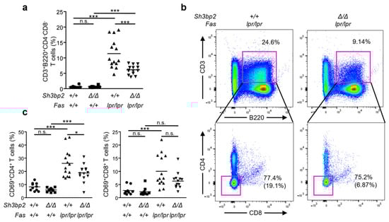 Faslpr/lpr lupus-prone mice are known to exhibit an aberrant pattern of T-cell subsets. One of the prominent subsets is B220+CD4-CD8- T cells, referred to as DNT cells []. Accumulation of these cells is caused by impaired Fas-mediated apoptosis of autoreactive lymphocytes []. Also, Faslpr/lpr mice have been reported to exhibit decreased naïve T cells and increased effector and activated T cells than those of wild-type mice []. We thus examined if SH3BP2 deficiency affects DNT cells in Faslpr/lpr mice. The proportion of DNT cells in the spleen of Faslpr/lpr mice was significantly elevated compared to that in Sh3bp2+/+ mice (Figure 3a). Interestingly, the aberrant accumulation of DNT cells in the spleen was improved in the Sh3bp2Δ/ΔFaslpr/lpr mice (Figure 3a,b).