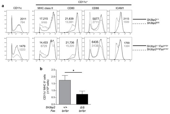 Next, we explored the differentiation of bone marrow cells into DCs. Interestingly, the differentiation into DCs, as determined by CD11c expression, was suppressed in both Sh3bp2Δ/Δ and Sh3bp2Δ/ΔFaslpr/lpr cells, compared to that in Sh3bp2+/+ and Faslpr/lpr cells, respectively (Figure 4a). The expression of MHC class II, CD80, CD86, and ICAM1 (CD54) gated on CD11c+ cells was diminished by the SH3BP2 deficiency in some of the CD11c+ cells (Figure 4a). These data suggest that SH3BP2 deficiency suppressed the differentiation of myeloid precursor cells into DCs.