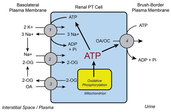 Generalized scheme showing coupling of various active transport processes in the renal proximal tubular (PT) cell to ATP levels and mitochondrial function. 1: (Na+ + K+)-stimulated ATPase; 2: sodium-dicarboxylate 3 cotransporter (NaC3; Slc13a3); 3: organic anion transporter 1 or 3 (Oat 1/3; Slc22a6/8); and 4: multidrug resistance-associated protein 2 or 4 (Mrp2/4; Abcc2/4) or P-glycoprotein (Mdr1; Abcb1). Abbreviations: OA: organic anion; OC: organic cation; 2-OG: 2-oxoglutarate; Pi: inorganic phosphate.