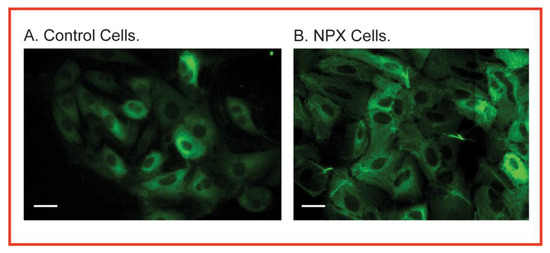 To better understand the biochemical and toxicological implications of CRH, we studied responses of the PT cell from the remnant kidney of NPX rats both in vivo and in vitro in a series of papers, focusing on mitochondrial function and oxidation–reduction (or redox) status [18,19,20,21,22,23,24,25,26,27]. Additionally, we examined the impact of CRH on the susceptibility of PT cells to several nephrotoxicants (e.g., inorganic mercury and tert-butyl hydroperoxide (tBH)), demonstrating that the altered cellular biochemistry and physiology result in increased cytotoxicity. Figure 2 shows the enlarged size and altered morphology of primary cultures of rat PT cells from NPX rats compared to those from normal rats. The figure is meant to provide a qualitative assessment of CRH, in which many, but not all, cells are enlarged. Cytokeratin staining, which is a marker for epithelial cells, was performed to better visualize individual cells.