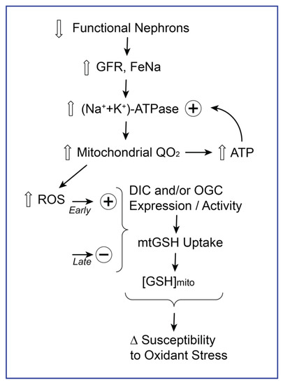 As shown in Figure 3, the initiating events in the CRH response include an increased glomerular filtration rate (GFR) and an increased fractional sodium excretion (FeNa). These events, in turn, activate the plasma membrane (Na+ + K+)-ATPase. Similar to the relationships illustrated in Figure 1, the activation of the (Na+ + K+)-ATPase increases the mitochondrial respiration rate (QO2) via increased ATP consumption. This increased respiratory rate results in increases in the release of reactive oxygen species (ROS). It is important to mechanistically distinguish between early responses to increases in ROS and those that occur with prolonged or more marked increases in these oxidant-promoting molecules. As described in the next section and conceptualized by Jones and colleagues [28,29,30,31], early increases in ROS are viewed as having a signaling function in regulating the redox circuitry of the mitochondria and other subcellular compartments. Thus, in PT cells from NPX rats, early increases were observed in activities (but not mRNA or protein expression) of the two mitochondrial transporters for GSH, the dicarboxylate and 2-oxoglutarate carriers (DIC and OGC, respectively), and in intramitochondrial concentrations of GSH [26,27]. At later times, however, mitochondrial GSH concentrations in PT cells from NPX rats have been found to decrease compared to those in PT cells from control rats, and an enhanced injury from a variety of toxicants has been observed [22,23,25].
