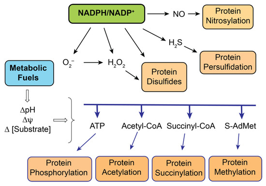 Involvement of mitochondrial metabolism and redox processes in the post-translational regulation of mitochondrial proteins and enzymes. The scheme illustrates the involvement of redox processes (acting through NADPH/NADP+) and metabolic processes to produce several types of protein modifications that can alter protein structure and/or function. Abbreviations: S-AdMet: S-adenosylmethionine; NO: nitric oxide. Adapted from [29].