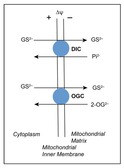 The reader is referred to earlier reviews of renal mtGSH transport for more background and details on the identification of specific carriers involved in the transport process [34,35,36]. The primary rationale for determining the derivation and regulation of mtGSH was based on the realizations that renal GSH synthesis appears to exclusively occur in the cytoplasm [37], that renal mitochondria contain a distinct pool of GSH with concentrations in the millimolar range [38], and that the GSH molecule has a net negative charge at physiological pH. Based on these facts and properties, as well as the presence of numerous carriers in the mitochondrial inner membrane for a diverse array of organic anions and zwitterions (including amino acids) [39], the most likely derivation of the mtGSH pool would be from transport of cytoplasmic GSH into the mitochondrial matrix via one or more electroneutral or electrogenic anion exchange carriers. In a series of studies with isolated renal cortical mitochondria from rat kidney and purified and reconstituted renal mitochondrial anion carriers [37,40,41], we demonstrated that two electroneutral anion exchangers in the renal mitochondrial inner membrane, the dicarboxylate carrier (DIC; Slc25a10), and the 2-oxoglutarate carrier (OGC; Slc25a11), account for most of the observable transport of GSH from the cytoplasm into the mitochondrial matrix. The function of these two carriers is illustrated in Figure 5.