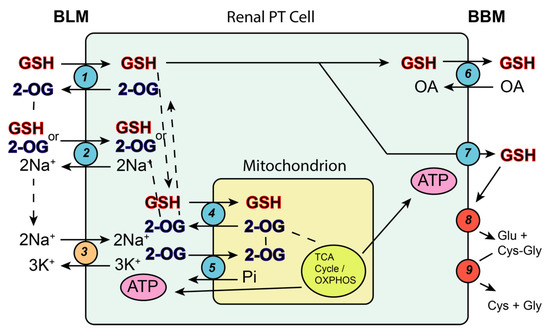In addition to the obvious role of mtGSH, which is present at millimolar concentrations, in maintaining the reduced state of mitochondrial protein thiols, the mtGSH pool is also closely linked to the metabolic state of the renal PT cell. This can be best appreciated by examining the role of 2-OG in mitochondrial intermediary metabolism and the various cellular GSH transport processes (Figure 6). Studies on the transport of GSH across the BLM from the interstitial space/plasma into the renal PT cell have shown that multiple carriers are involved, including Oat3, (possibly) Oat1, and NaC3 [34,51]. 2-OG serves as a co-substrate for all of these carriers, providing the link with the mitochondrial carriers for GSH.