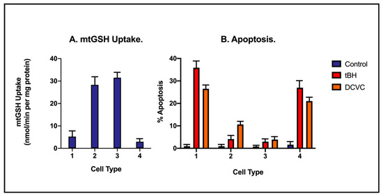 A clear demonstration of the importance of these mitochondrial anion transporters in maintaining mitochondrial and cellular function was provided by studies conducted in Normal Rat Kidney 52 Epithelial (NRK-52E) cells, an immortalized cell line derived from rat PT cells. Although these cells exhibit some of the limitations of other immortalized cell lines, they exhibit many properties of in vivo renal PT cells with respect to mitochondrial function and GSH status [52]. To assess the impact of different levels of mtGSH transport function in a renal PT cell line, initial rates of GSH uptake into mitochondria and apoptosis caused by two previously well-characterized mitochondrial toxicants, tBH and S-(1,2-dichlorovinyl)-L-cysteine (DCVC), were assessed in four types of NRK-52E cells that express varying levels of mtGSH transporter activity (Figure 7).