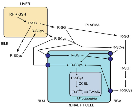 Interorgan metabolism of nephrotoxic GSH and cysteine S-conjugates. The scheme emphasizes the roles of initial GSH conjugation, which primarily occurs in the liver, and interorgan transport pathways that deliver either the GSH S-conjugate or the cysteine S-conjugate to the kidneys, which rapidly transport these conjugates into the PT cell, where the cysteine S-conjugate can be bioactivated by the cysteine conjugate beta-lyase (CCBL) within mitochondria to produce a reactive thiolate or related metabolites (e.g., [R-S–]) that cause toxicity.
