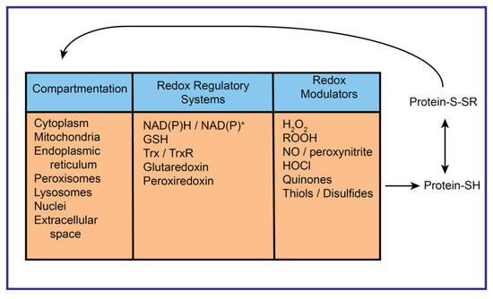 Although the loss of mtGSH clearly sensitizes cells to oxidants and many other types of cytotoxic chemicals, the GSH redox system is not the only one that functions to regulate redox status in mitochondria in the kidneys or other tissues. Jones and colleagues [80,81,82] characterized the role of the thioredoxin (Trx)–thioredoxin reductase (TrxR) system in multiple subcellular compartments, including the mitochondria, as an additional component. In a series of reviews [29,30,32,83,84,85], Jones and colleagues further conceptualized the signaling pathways that regulate redox systems, the redox proteome, and cellular energetics. In this redox systems approach, there are three main components that act to modulate protein cysteinyl residues, resulting in altered protein function (Figure 9). While events impacting cellular function and redox status occur in virtually every subcellular compartment and in the extracellular space, the mitochondria are prominent because of their high rate of metabolic activity in a concentrated space and the existence of numerous redox-sensitive targets. Redox modulators include ROS such as H2O2 and organic peroxides (ROOH), RNS such as NO and peroxynitrite, hypochlorous acid (HOCl), quinones such as ubiquinone, and various thiols and disulfides.